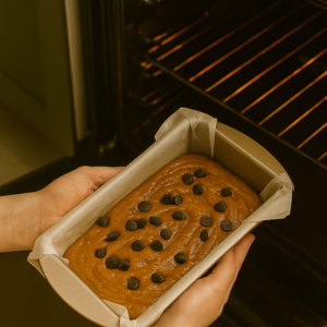 - BakeSpread the batter into the prepared loaf pan. Top with a few extra chocolate chips for a pretty finish.Bake for 50–60 minutes, or until a toothpick inserted into the center comes out mostly clean.