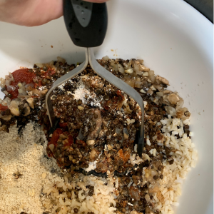 - Mix the Burger BaseIn a large bowl, combine lentils, quinoa, mushroom-onion mixture, oats, walnuts, tomato paste, soy sauce, spices, and flax egg.Mash about half of the mixture with a fork or potato masher (leave some chunks for texture). The mixture should stick together when pressed.